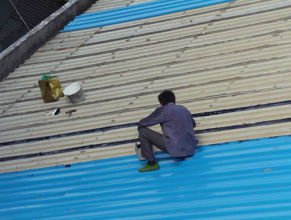 4、漏水维修时可以在屋面所有接缝,风机管道周围,采光板,螺钉等易渗水部位,采用耐候性好的弹性防水涂料和特殊的缝织聚酯布,多次涂刷而形成的无缝防水体系,针对旧厂房改造或者旧屋面翻新,在整个屋面达到防水要求后,再在屋面整体喷涂两遍防水涂料